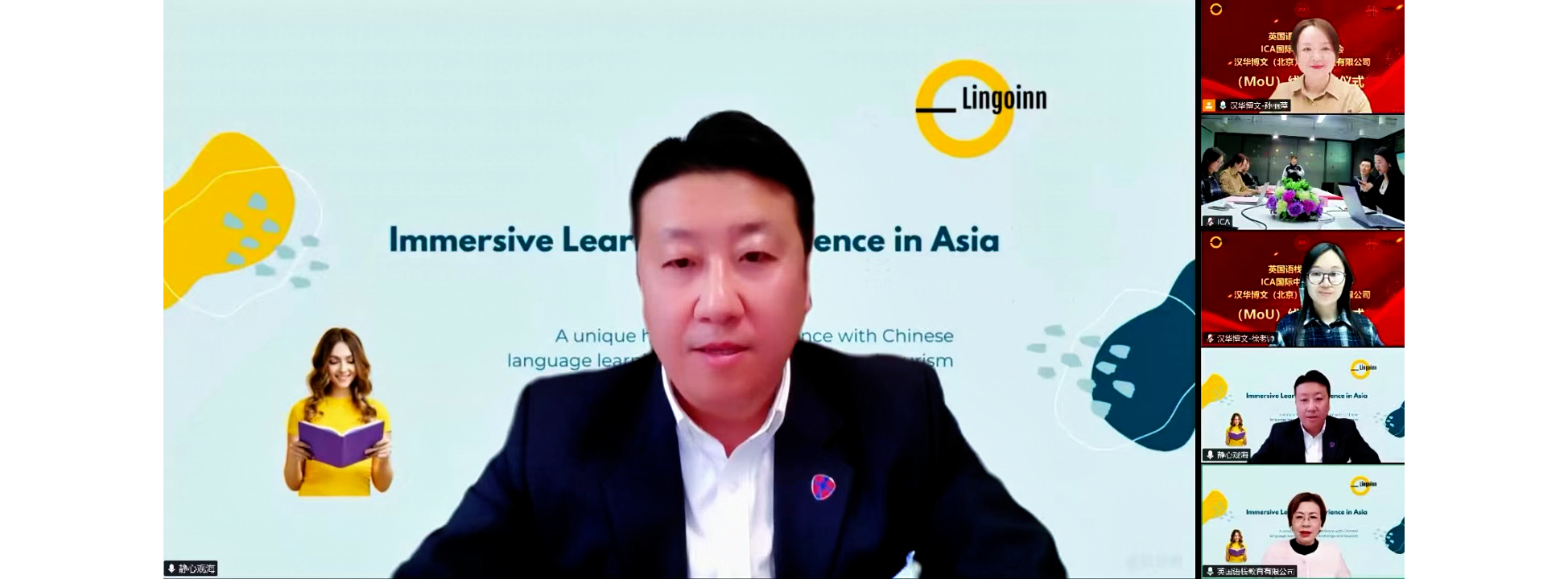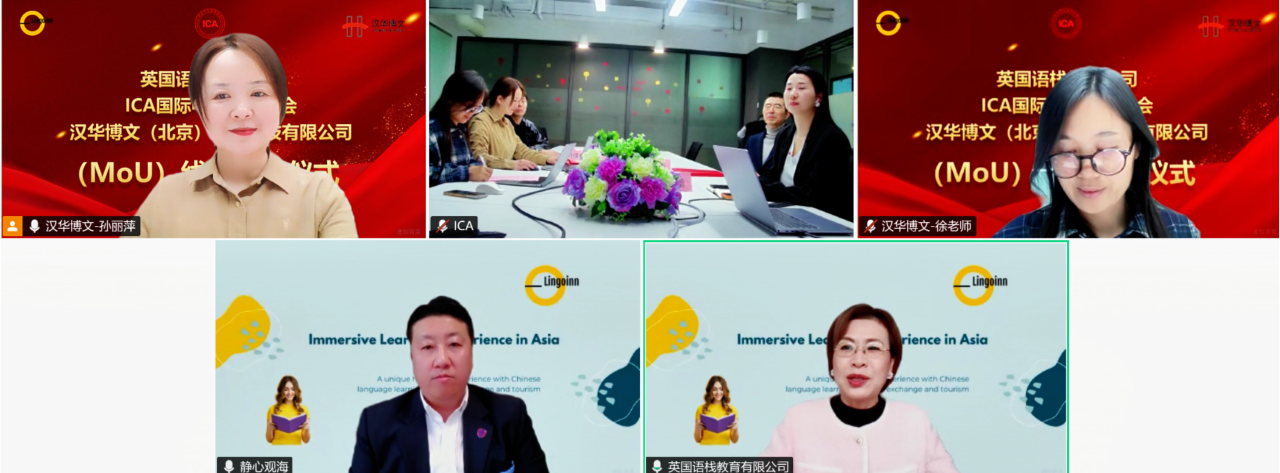 3月3日,ICA国际中文教师协会、英国语栈教育有限公司(Lingoinn Limited)、汉华博文(北京)教育科技有限公司三方在线正式签署战略合作协议(MoU),以公益协同、资源互补为核心,携手推进国际中文教育高质量发展,搭建中外文化交流新桥梁,同时助力拓宽社会就业渠道,实现多方共赢。ICA国际中文教师协会首席代表张海波、商务部经理于春蕾、英国语栈教育有限公司创始人兼学术总监黄影红,英国语栈教育有限公司中国区商务代表孙洪海、汉华博文(北京)教育科技有限公司运营总监孙丽萍、汉华博文国际项目负责人徐腊香、市场部负责人何儒晖等出席签约仪式,共同见证这一重要时刻。